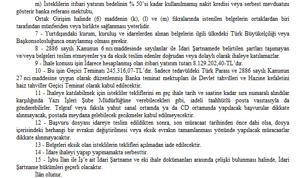 Yapılacak olan ihale 31 Mayıs 2017 günü saat 17.00'de Eskişehir Büyükşehir Belediyesi'nde kapalı teklif usulüyle gerçekleştirilecek.