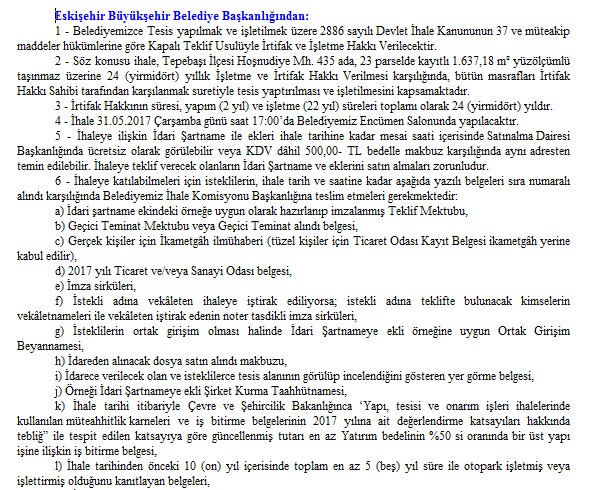 Eskişehir Büyükşehir Belediyesi Başkanlığı tarafından Tepebaşı İlçesi, Hoşnudiye Mahallesi, 435 ada, 23 parselde kayıtlı olan 1.637 metrekare alana sahip gayrimenkul üzerine 24 yıllık işletme ve irtifak hakkı verilmesi karşılığında, bütün masrafların bu hakkın sahibi tarafından karşılanmak üzere tesis yaptırılması ve işletmesi ihalesi yapılacak.