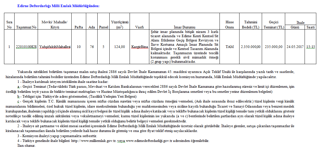 Edirne Defterdarlığı Milli Emlak Müdürlüğü tarafından Yahşifkih Mahallesi, 76 ada, 5 parselde bulunan kargir bina satışa çıkarıldı. Yüzölçümü 124 metrekare olan kargir binanın tamamı ihaleye dahil. Kargir binanın tahmini fiyatı 2 milyon 350 bin lira olup 235 bin lira ise geçici teminat bedeli olarak gösteriliyor.