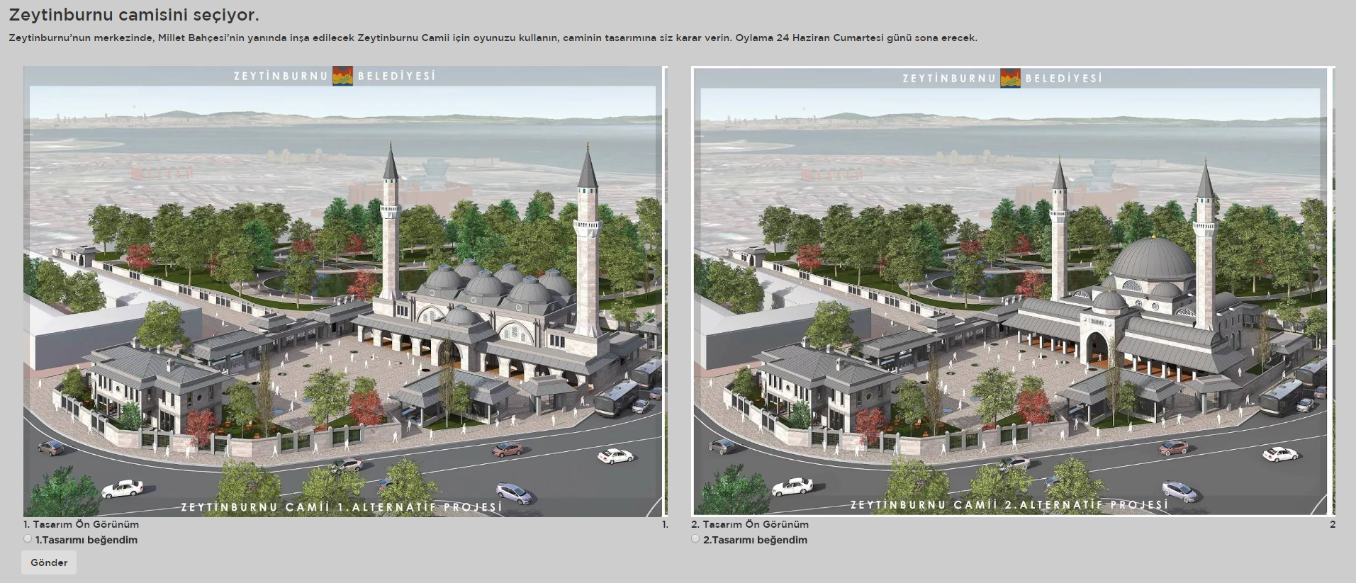 Zeytinburnu, kendi camisini seçiyor. Yakın tarihte yapılacak olan 94 bin metrekarelik Millet Bahçesi’nin hemen yanına inşa edilecek Zeytinburnu Camii için 2 ayrı tasarım hazırlatan Zeytinburnu Belediyesi, 5000 metrekarelik caminin tasarımını Zeytinburnulu vatandaşların oylamasına sundu. Görsellerin oylanacağı projede 2 farklı mimari tasarımı vatandaşların beğenisine sunan Zeytinburnu Belediyesi, 24 Haziran Cumartesi gününe kadar devam edecek oylamalar neticesinde en çok oy alan camiyi Zeytinburnu’na inşa edecek.