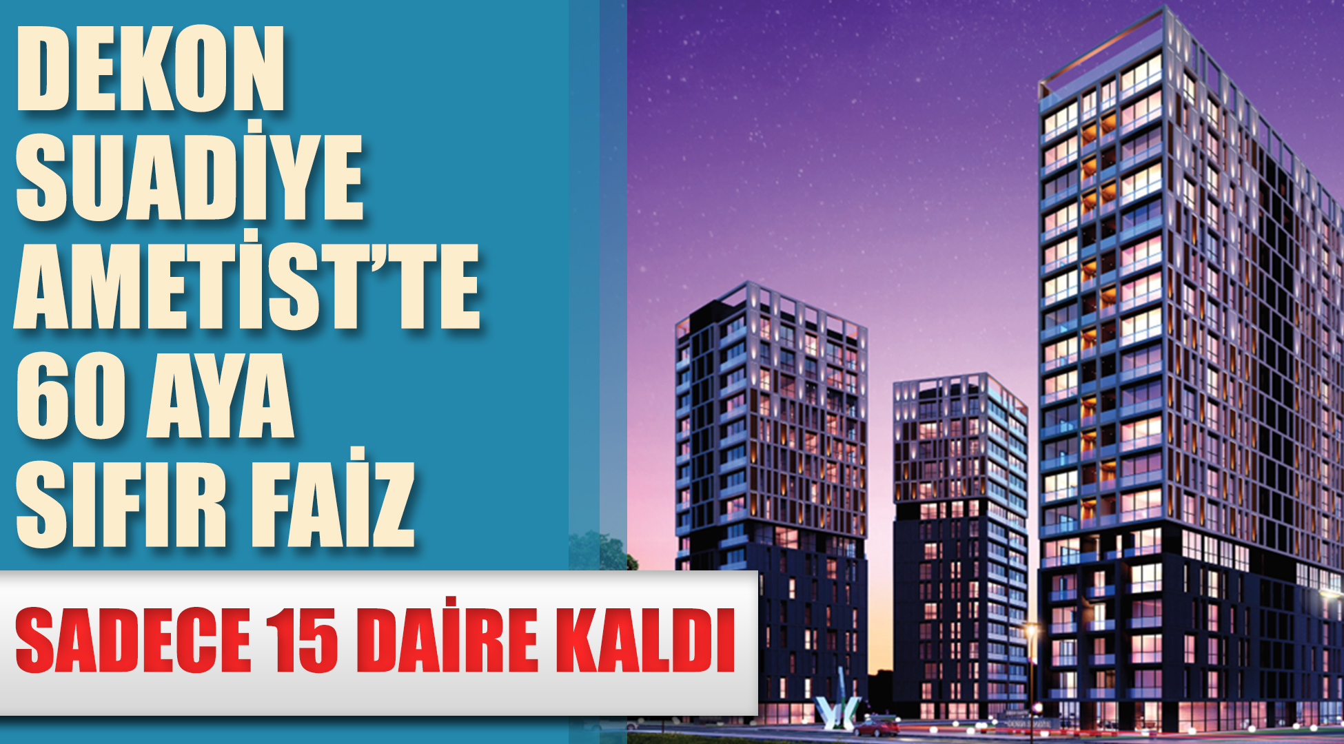 Dekon İnşaat'ın Suadiye’de inşa ettiği, Bağdat Caddesi’nin nadir site konseptli projelerinden Dekon Suadiye Ametist’te daire sahibi olmak isteyenler İş Bankası’ndan 60 aya 0, 120 aya 0.60 faiz oranıyla kredi kullanabilecekler. Üç blok ve 152 daireden oluşan, Ağustos 2017 tapusuyla birlikte teslim edilecek Dekon Suadiye Ametist’te son 15 daire kaldı.