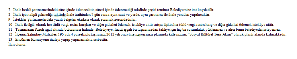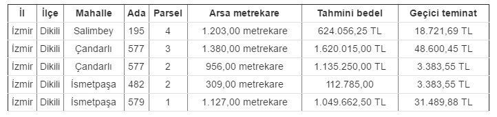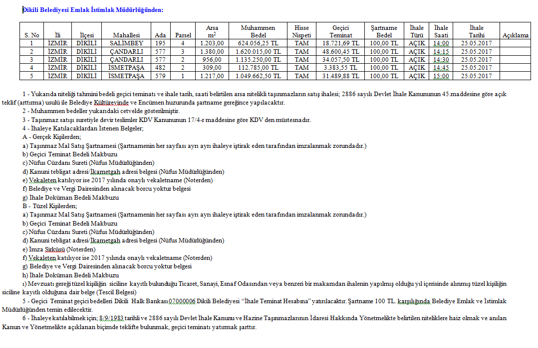 Dikili Belediye Emlak İstimlak Müdürlüğü tarafından İzmir ili, Dikili ilçesi, Salimbey mahallesi, Çandara Mahallesi, İsmetpaşa Mahallesi sınırları içerisinde bulunan 5 adet arsa satışa çıkarıldı. Yüzölçümleri 309 metrekareyle 1.380 metrekare arasında değişiklik gösteren arsaların tamamı ihaleye dahil.