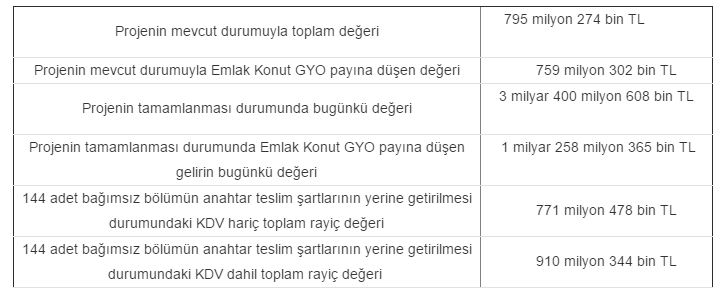 Gayrimenkul değerleme raporu Merkez Ankara'nın tamamlanması durumundaki toplam değeri, projenin mevcut durum değeri, proje kapsamında yer alan 144 bağımsız bölümün güncel piyasa rayiç değerinin SPK mevzuatı ve sözleşme gereği rayiç değerlerinin tespiti için hazırlandı.Merkez Ankara projesi 2 bin 20 konut ile 1,320 ticari birimden oluşacak. Pasifik İnşaat ile Çiftay İnşaat ortaklığında inşa edilecen olan Merkez Ankara için Emlak Konut GYO, 3 bin 230 bağımsız bölümün yapı ruhsatını aldı.