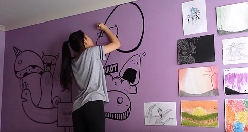 Genç tasarımcı oda duvarına yaptığı çizimle bakın nasıl farklı bir hava oluşturuyor.